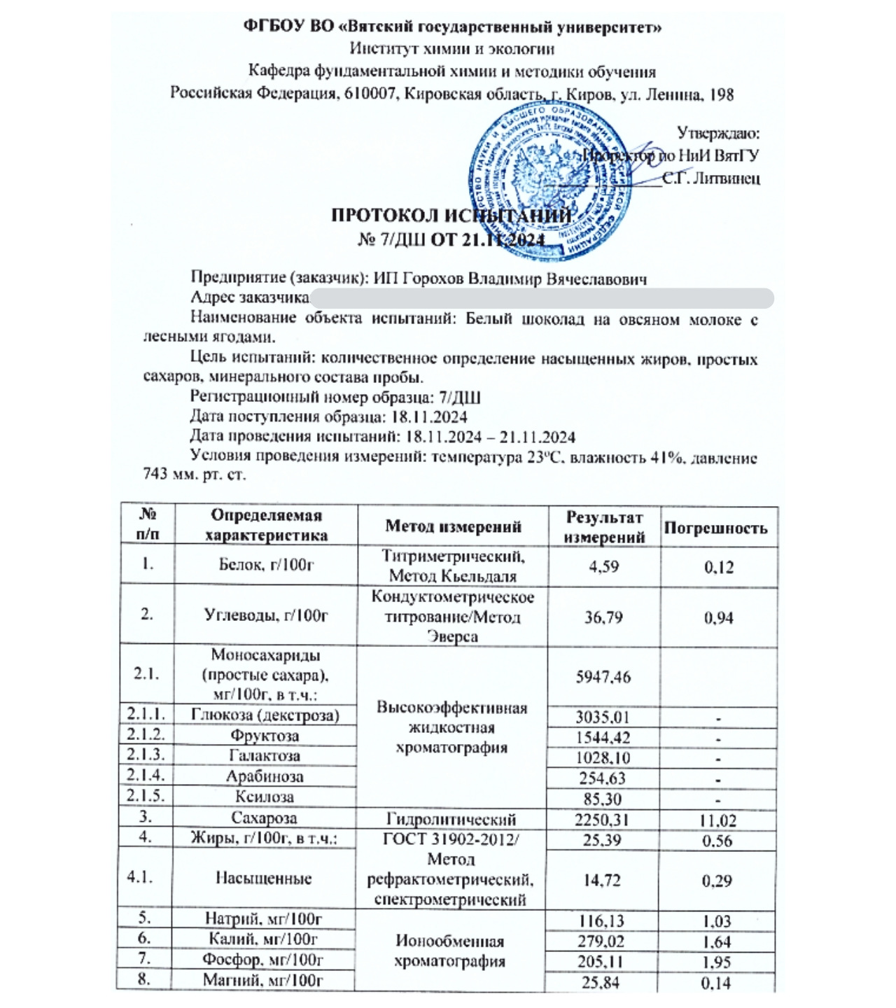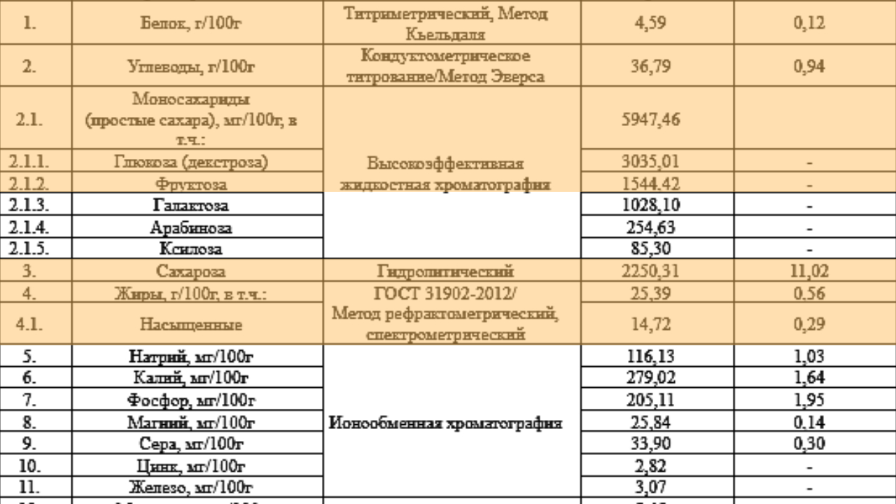 Когда мы получили результаты исследований из лаборатории Вятского государственного университета, стало понятно: перед нами не просто десерт, а почти нутрицевтик в самой вкусной. Его состав оказался впечатляющим: сбалансированным и полезным.