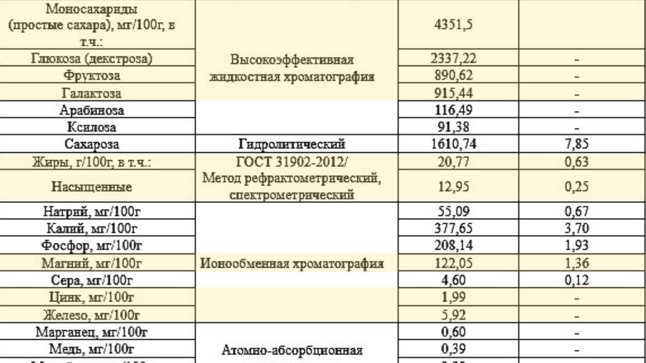 По данным испытаний, в 100 граммах продукта содержится более 4300 мг простых сахаров — глюкозы, фруктозы, галактозы, но не добавленных, а природных, из натуральных компонентов. Благодаря этому