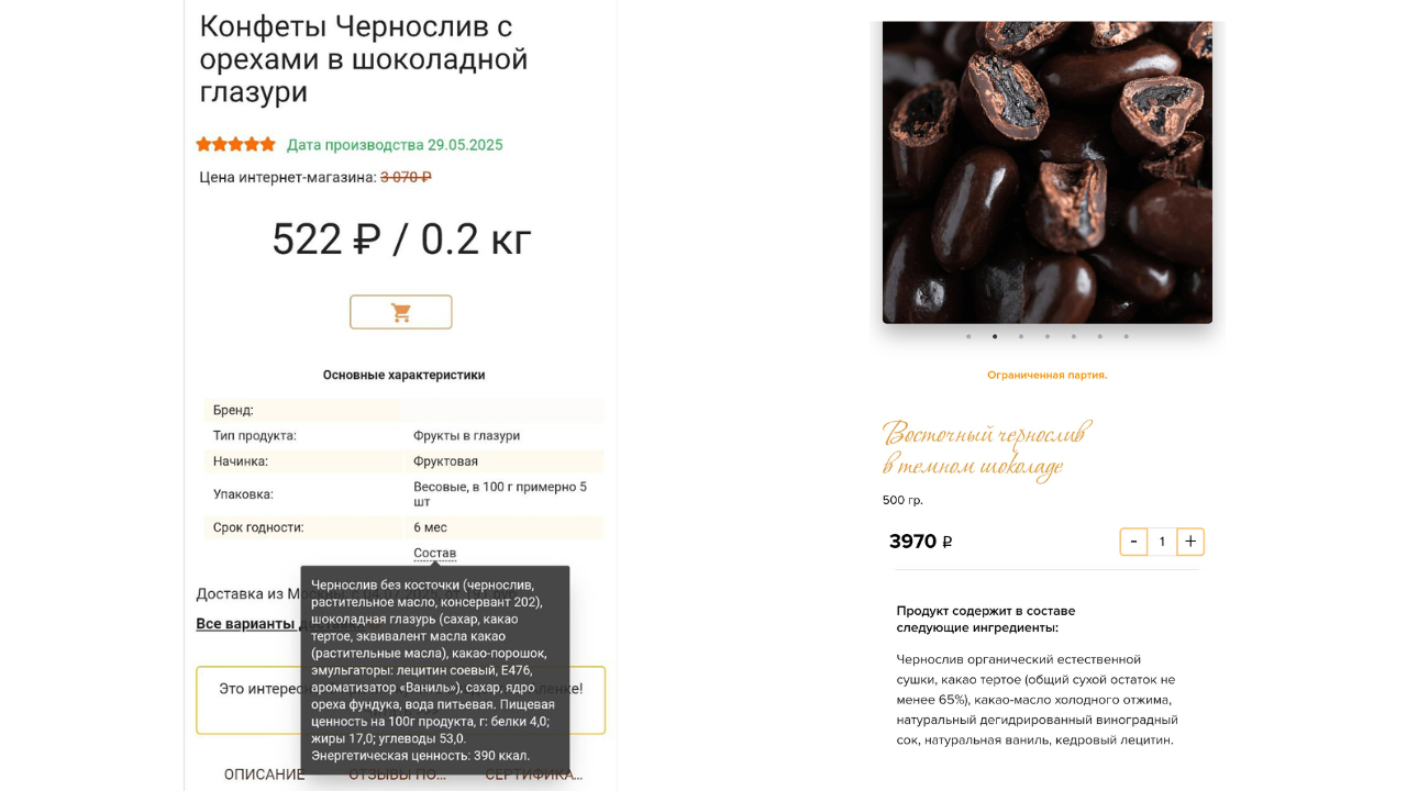 Вы точно видели эти конфеты. Фиолетовый фантик, название — «Чернослив с орехом в шоколаде». Лежат на полках почти в каждом супермаркете. Чернослив, шоколад, фундук — звучит аппетитно. И цена приятная: 522 ₽ за 200 г. А вот у нас, в Доме Шоколада, почти в три раза дороже.— 1 588 ₽. Возникает вопрос: почему чернослив в шоколаде стоит так по-разному? Давайте разбираться.