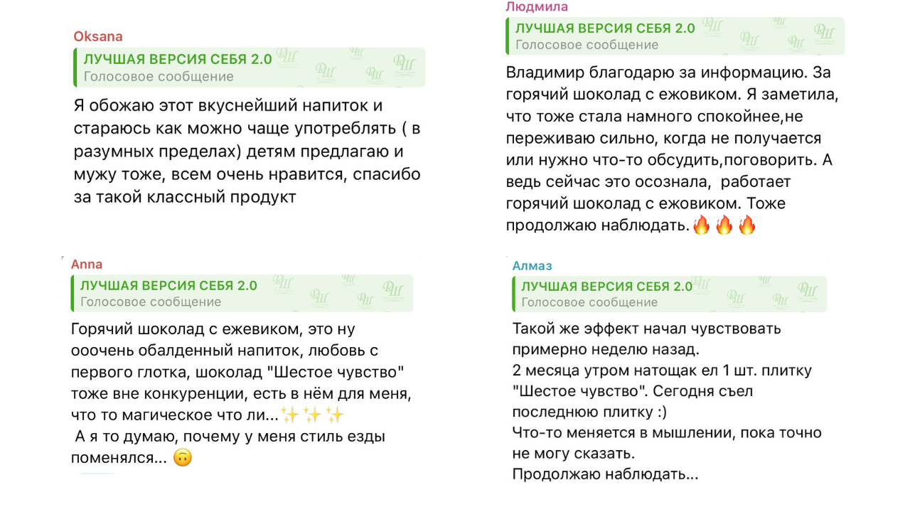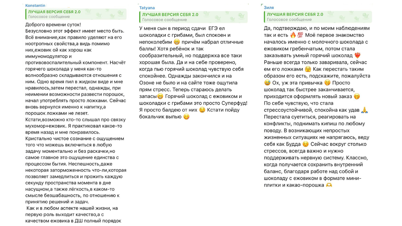 Наш продукт использовали спортсмены баскетбольной медиалиги России перед играми. Они заметили, что когда съедали за час до игры порцию шоколада или выпивали чашку горячего шоколада с ежовиком, у них снижалось волнение перед игрой. По их ощущениям