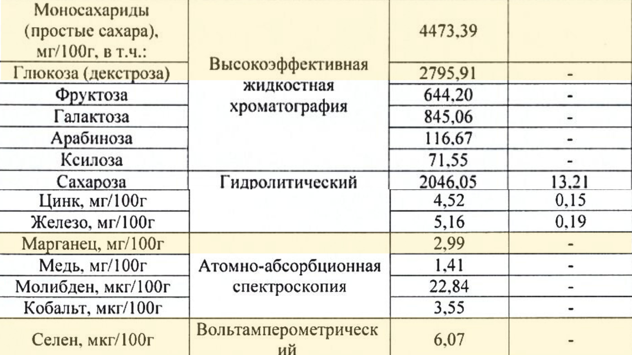 Лабораторные исследования показали, что в 100 г продукта содержится 5,16 мг железа и 4,52 мг цинка – это важные микроэлементы, которые поддерживают кроветворение и работу сердца.