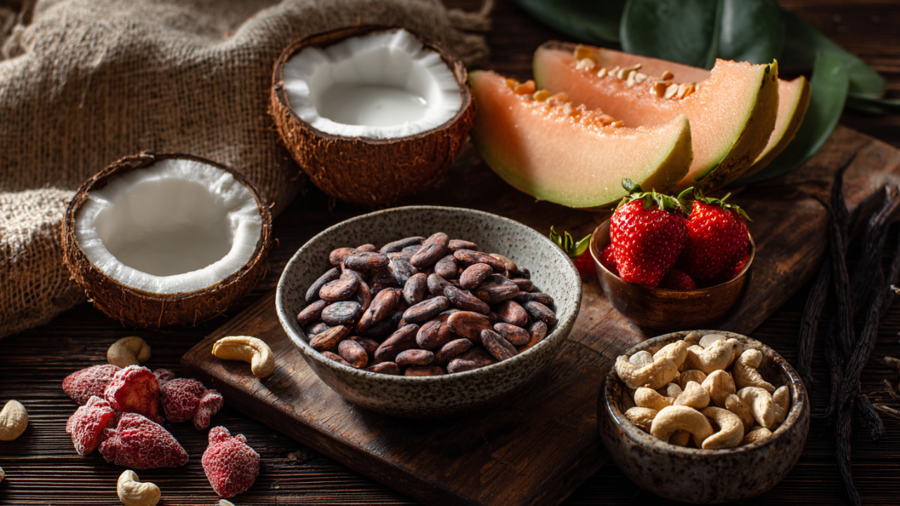 Фруктовые соки клубники и дыни дают легкую сладость и витамины, а кокосовое молоко смягчает кислотность и способствует лучшему усвоению жирорастворимых витаминов (A, E, K).