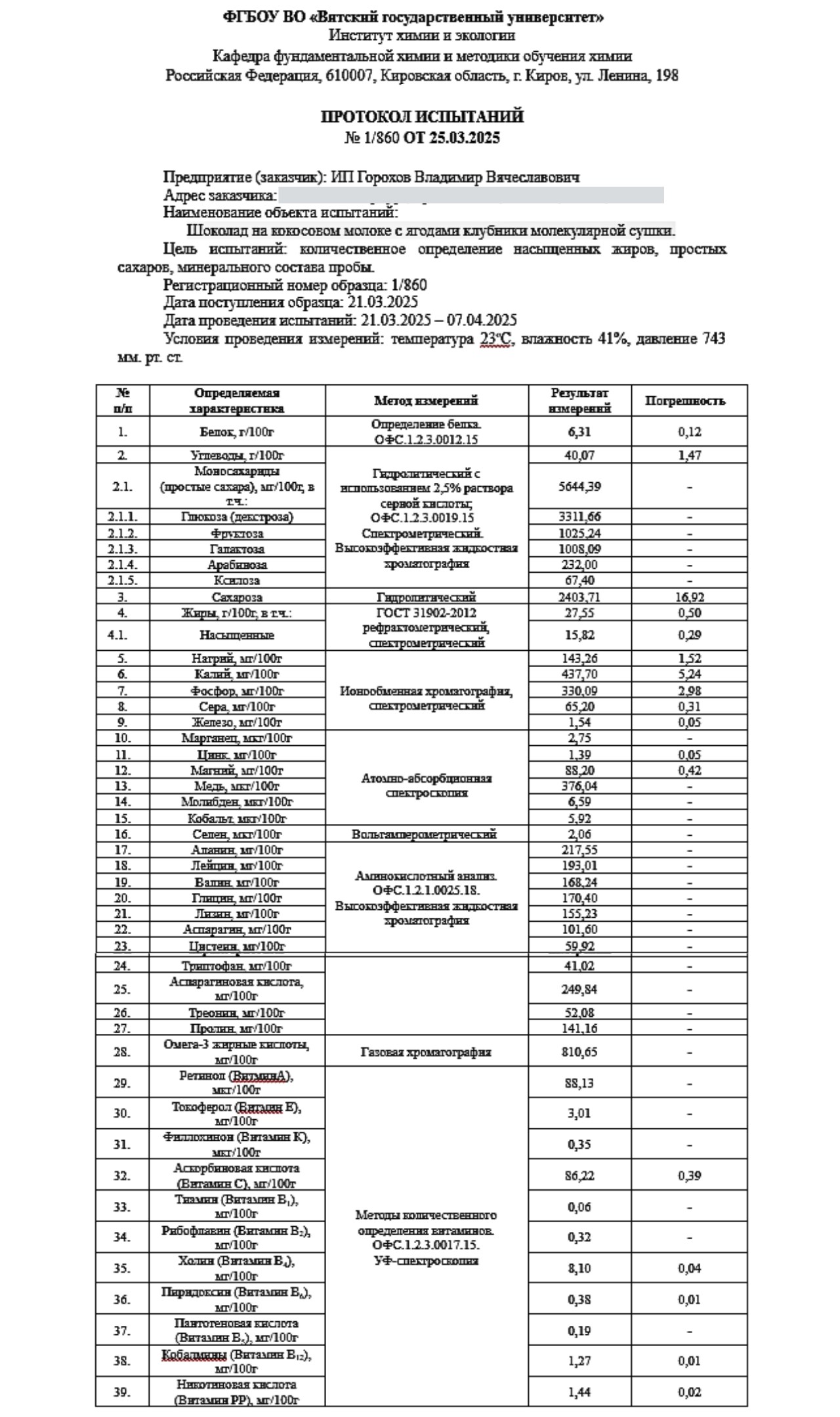 Шоколад на кокосовом молоке с ягодами клубники молекулярной сушки в числе других продуктов Дома Шоколада отправился в лабораторию Вятского государственного университета, где его состав исследовали самым тщательным образом. И обнаружили, что он насыщен витаминами и питательными элементами, а также очень вкусный.