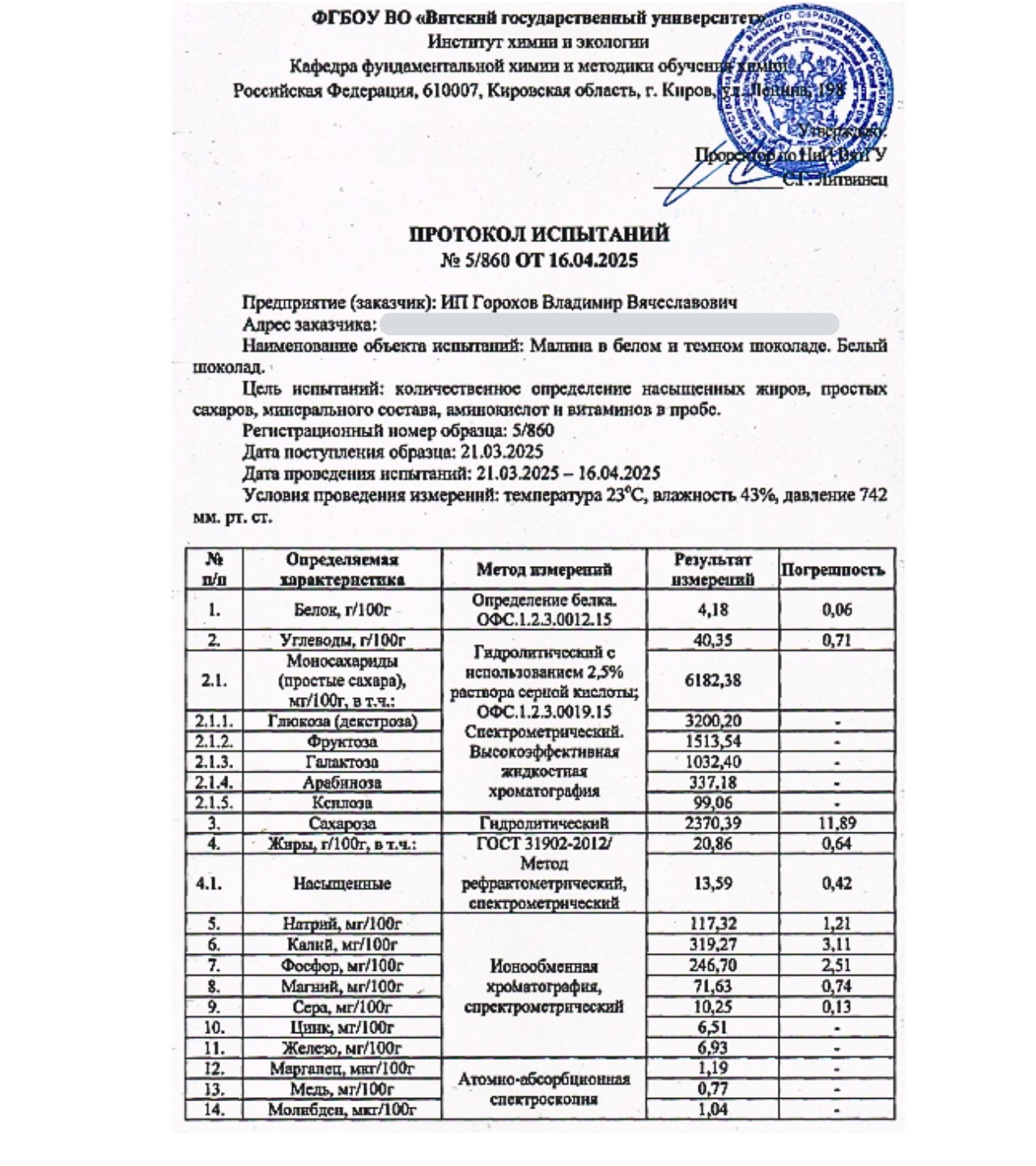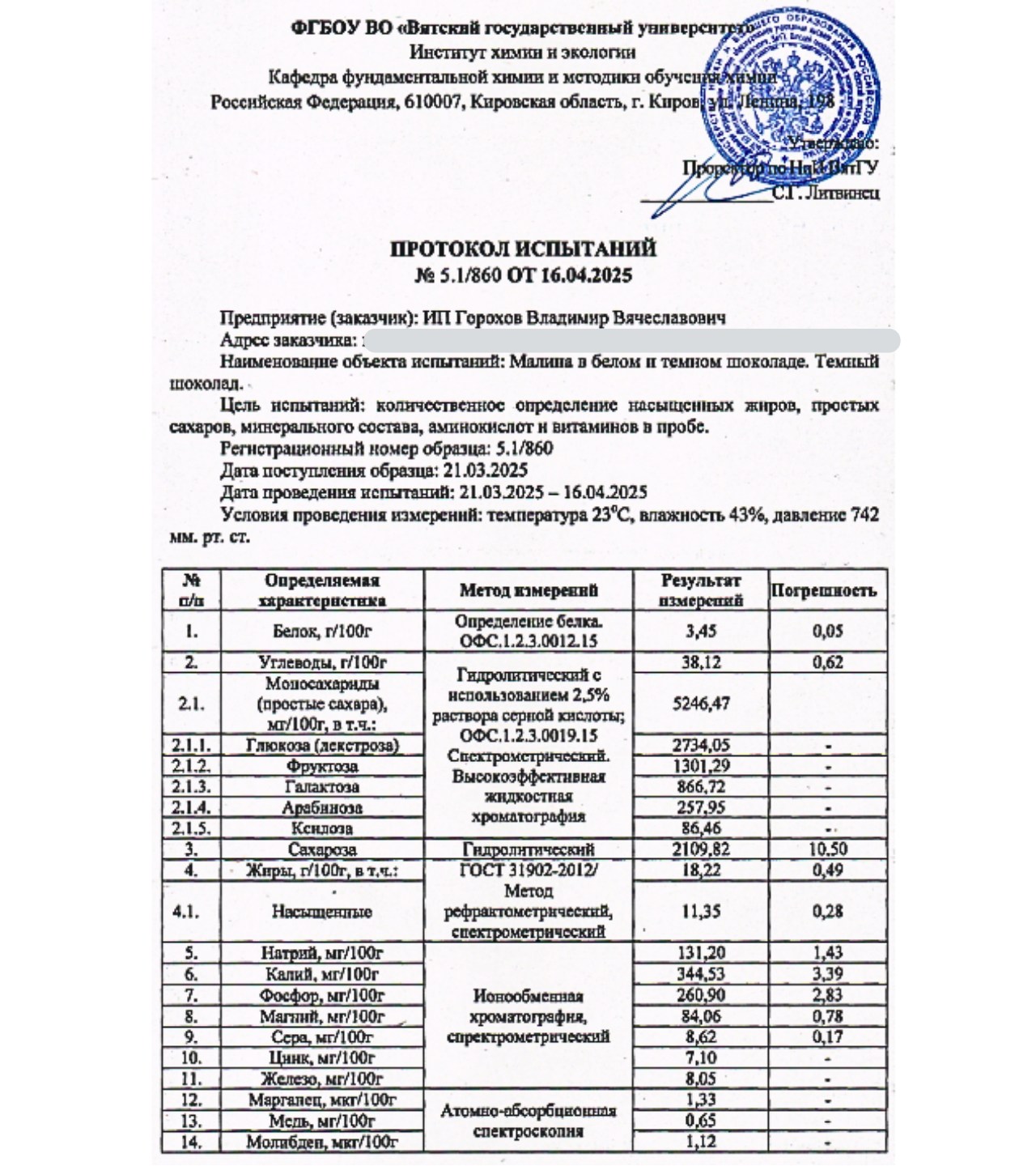 Малины в темном и белом шоколаде. Настолько, что отправили ее на анализ в Вятский государственный университет. Причем подошли серьезно: белый и темный шоколад исследовали по отдельности, чтобы и подтвердить качество, и понять, что на самом деле ест человек, когда открывает эту упаковку.