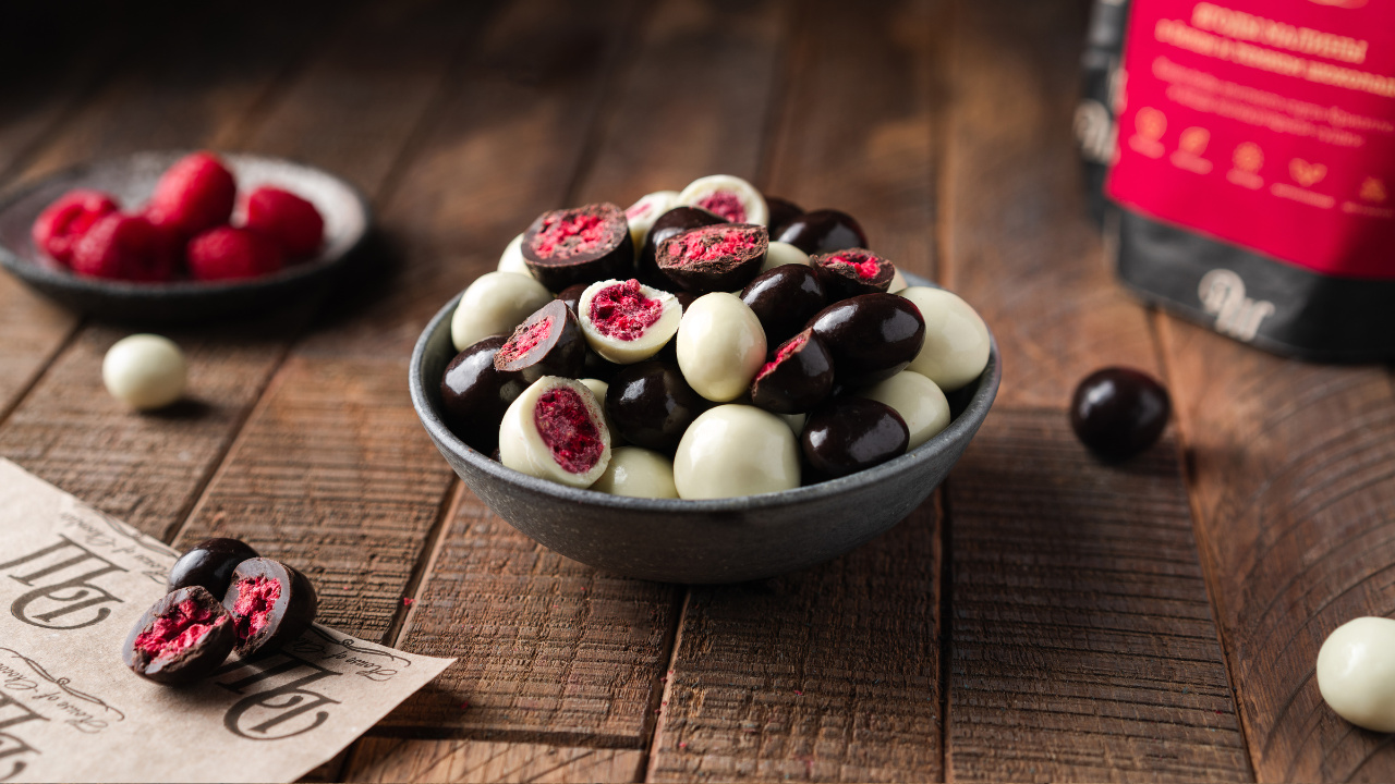 Белый шоколад с малиной — это про мягкость, нежность и сладость, знакомую с детства. Он чуть жирнее, а ещё содержит немного больше натуральных сахаров. Именно поэтому он воспринимается как более сливочный, обволакивающий, комфортный вкус. В нем больше глюкозы и галактозы, которые быстро включаются в метаболизм и дают ощущение энергии — особенно полезно в моменты, когда "всё падает из рук" и хочется что-то вкусное прямо сейчас.