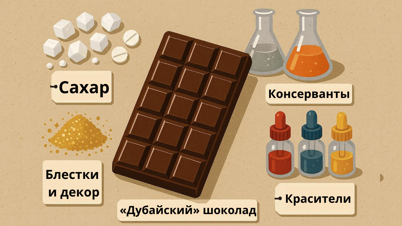 В описанных рецептах «дубайских» аналогов мы видим классическую картину массовой кондитерки: сахар (или искусственные подсластители) + стабилизаторы/эмульгаторы + консерванты + визуальные украшения.