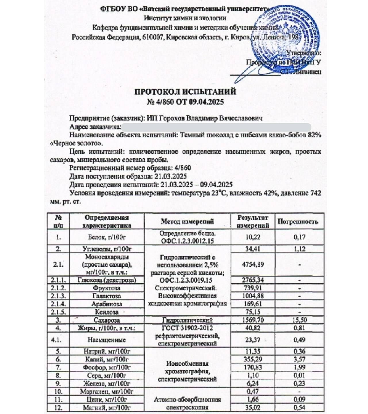тёмного шоколада с нибсами какао-бобов 82% «Черное золото» в лаборатории Вятского государственного университета. Мы не ограничились общей пищевой ценностью — анализ охватил жиры, углеводы, минералы, витамины, аминокислоты. Это было научное, серьезное намерение — доказать вам, что шоколад может быть не просто безвредным, а объективно полезным продуктом.