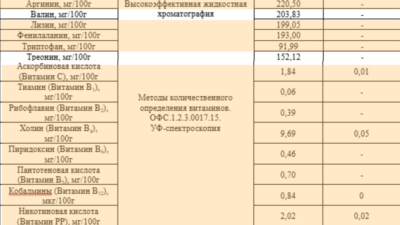 Также в составе — почти весь спектр витаминов группы B: В6 — 0,46 мг, В2 — 0,39 мг, никотиновая кислота — 2,02 мг, холин — 9,69 мг —