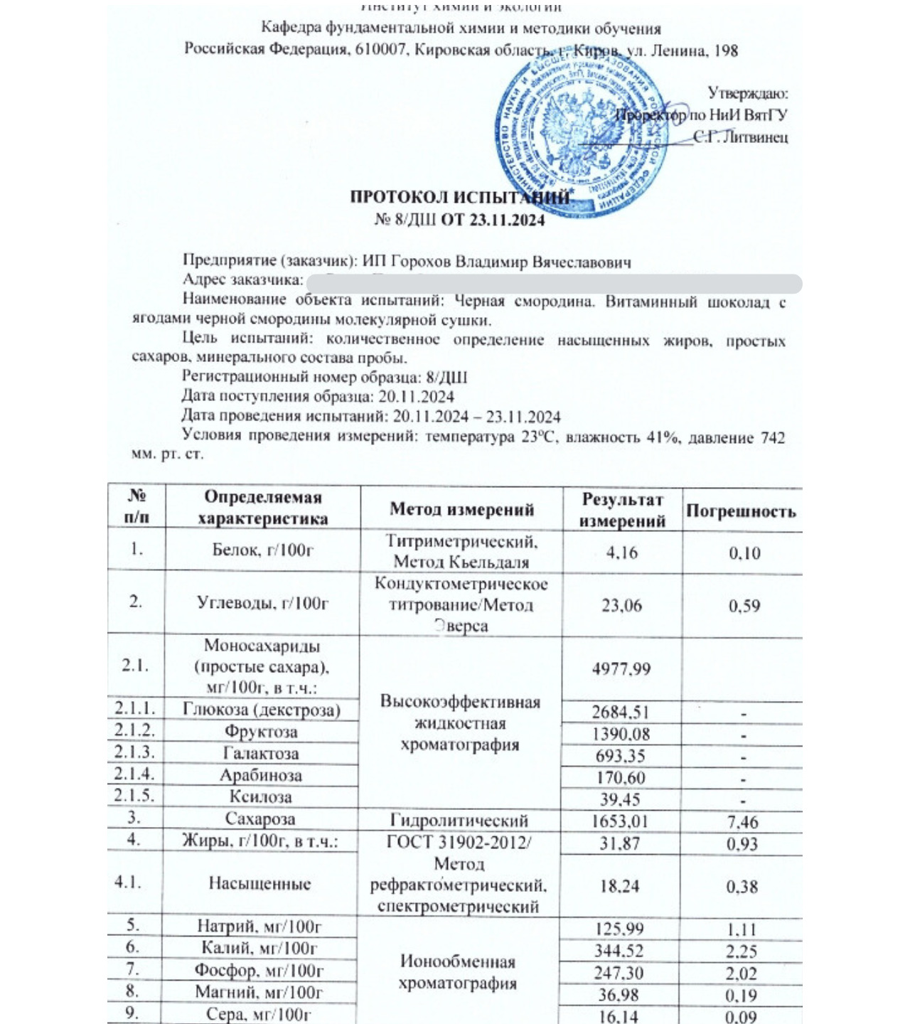 шоколада с черной смородиной молекулярной сушки, проведенного Вятским государственным университетом. Протокол испытаний от 23.11.2024 официально подтверждает: этот продукт — нечто большее, чем просто лакомство.