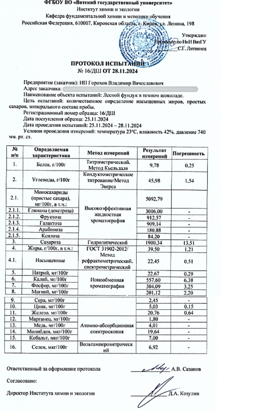 Кстати, пользу и богатый витаминно-минеральный состав этого продукта подтверждают научные исследования, которые провели ученые Вятского Государственного Университета. С результатами анализов можете ознакомиться здесь. Они подтверждают, что это натуральный продукт, который не просто порадует вас своим вкусом, но и помогает мозгу, сердцу, сосудам и коже благодаря ценным жирам, минералам и антиоксидантам. Фундук в темном шоколаде стабилизирует уровень сахара в крови, дает энергию без резких скачков и насыщает организм веществами, которых часто не хватает в повседневном питании. Идеален для тех, кто хочет есть сладкое без вреда и с настоящей пользой.