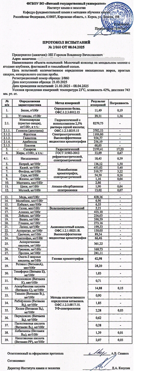 Добавьте его в свой заказ, и лучше не одну плитку, пока он есть в наличии. Этот шоколад не просто радует вкусом — он заботится о вашем настроении, коже, энергии и даже гормональном балансе. Он помогает тем, кто устал от бессмысленных перекусов, скачков сахара и таблеток с обещаниями пользы. Если вам хочется сладкого, которое действительно работает на здоровье — это ваш вариант. Вкусно, натурально, с умом — и без чувства вины. Мы доказали его пользу: шоколад прошел исследования состава на кафедре химии Вятского Государственного Университета. С протоколом исследования ознакомьтесь прямо сейчас, он прикреплен ниже. А полную расшифровку анализа читайте по этой ссылке