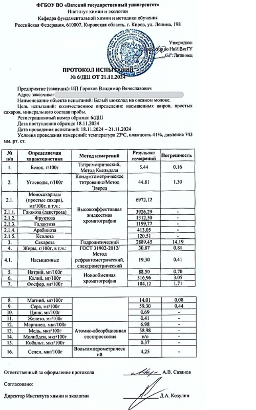 В ноябре 2024 г этот шоколад отправился на исследование в Вятский Государственный Университет. Результаты анализа и протоколы исследований читайте по этой сслылке