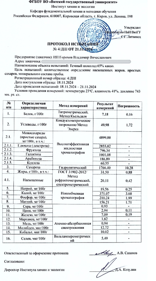 Этот шоколад — не просто десерт, а полноценная пищевая добавка с научно доказанной пользой. Он поддерживает энергию, снижает уровень стресса, питает мозг и иммунитет, не вызывая скачков сахара в крови. Благодаря сочетанию антиоксидантов, минералов и натуральных сахаров, он помогает сохранить бодрость, концентрацию и устойчивое настроение в течение дня. Это идеальный выбор для тех, кто хочет быть в ресурсе без кофеина, сахара и резких падений энергии. Эти свойства научно доказаны учеными: в конце 2024 года анализ состава провели в Вятском Государственном Университете. Подробно о результатах мы рассказываем в этой статье. Протокол исследований прикреплен ниже, ознакомьтесь пожалуйста.