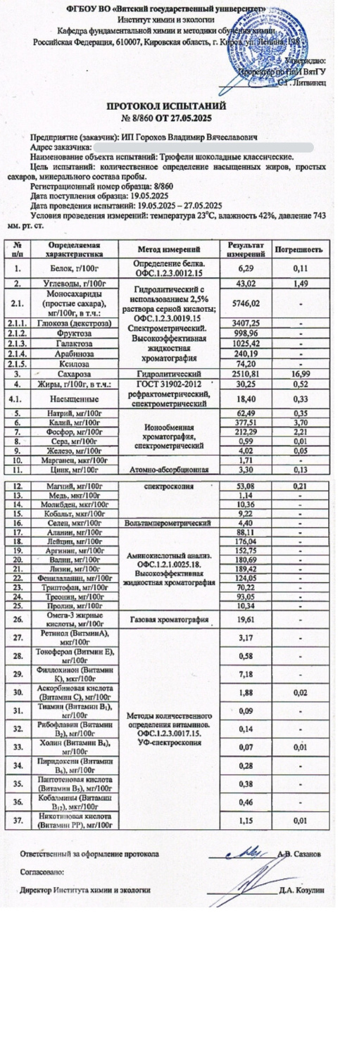 Классические шоколадные трюфели помогают справиться с чувством усталости, нехваткой энергии. Благодаря низкой гликемической нагрузке, богатому минеральному составу и аминокислотам, они поддерживают настроение, энергию и работу нервной системы — особенно в моменты стресса или переутомления. Это сладкое удовольствие, которое не только не мешает вашему самочувствию, но и бережно его поддерживает. И это доказанный факт: в мае 2025 года состав Классических шоколадных трюфелей проанализировали по 37 параметрам ученые Вятского Государственного Университета. Полную статью с расшифровкой анализов читайте по этой ссылке. А с протоколом ознакомьтесь прямо сейчас, он прикреплен ниже