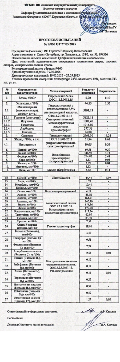 Это не просто десерт, а комплексная поддержка вашего организма: витамины, аминокислоты и минералы работают вместе, чтобы укрепить иммунитет, снизить стресс, поддержать сердце и мозг. Трюфели насыщают без скачков сахара, дают устойчивую энергию и улучшают настроение — без лишнего сахара и без вредных добавок. Подходят тем, кто хочет сладкого, но выбирает пользу, вкус и научно подтвержденное качество. Мы подтвердили его исследованиями состава на базе Вятского Государственного Университета. Подробнее об исследованиях читайте по этой ссылке, а протокол по результатам смотрите ниже.