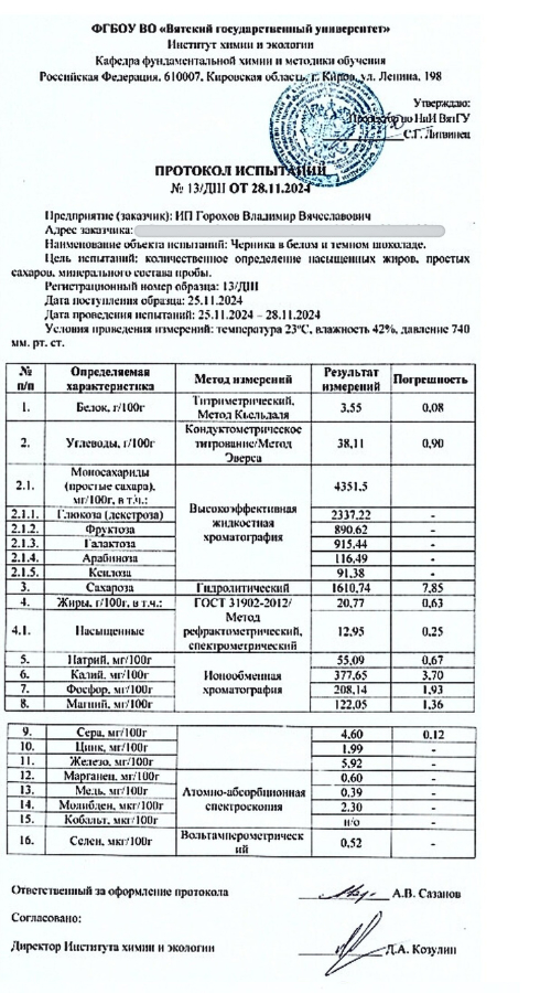 С научной точки зрения Черника в шоколаде - настоящая питательная добавка к пище. Это доказывают исследования состава шоколада, проведенные в Вятском Государственном Университете. Результаты смотрите здесь. Протокол прикреплен ниже, можете ознакомиться