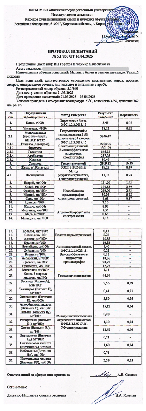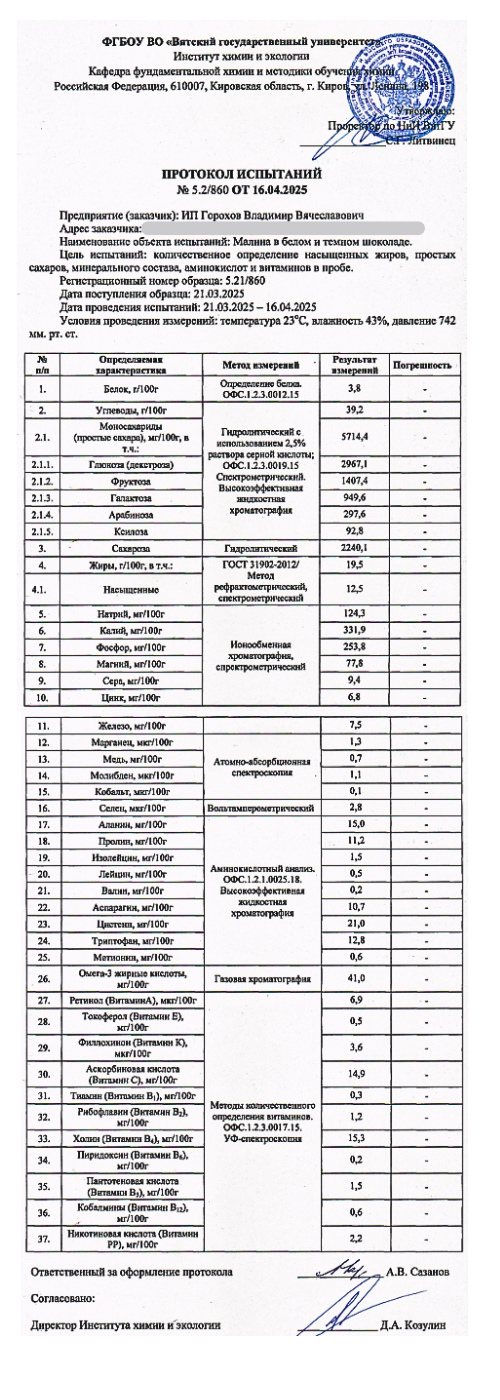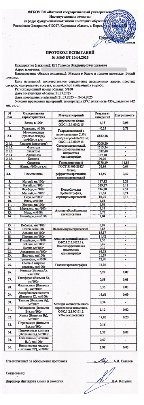 Малина в шоколаде – максимум пользы и удовольствия для детей и взрослых в каждом шарике. А еще насыщает витаминами, микроэлементами и аминокислотами, поддерживает иммунитет, энергию и настроение без скачков сахара в крови. Благодаря натуральным сахарам, молекулярной сушке ягод и отсутствию добавленного сахара, этот продукт подходит тем, кто хочет есть сладкое без чувства вины. Пользу Малины в шоколаде доказали исследования ее состава, проведенные в Вятском Государственном Университете. Подробнее о них читайте здесь. А протоколы анализов смотрите прямо сейчас, мы прикрепили их чуть ниже.